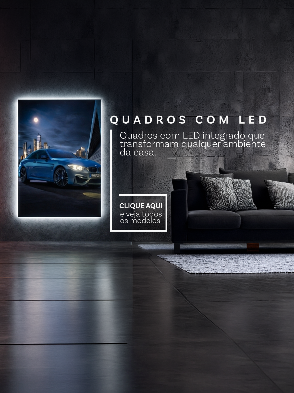 Com artes exclusivas de supercarros e clássicos icônicos, nossas peças contam com iluminação LED integrada, impressão de alta qualidade e acabamento em acrílico, garantindo profundidade, brilho e sofisticação.